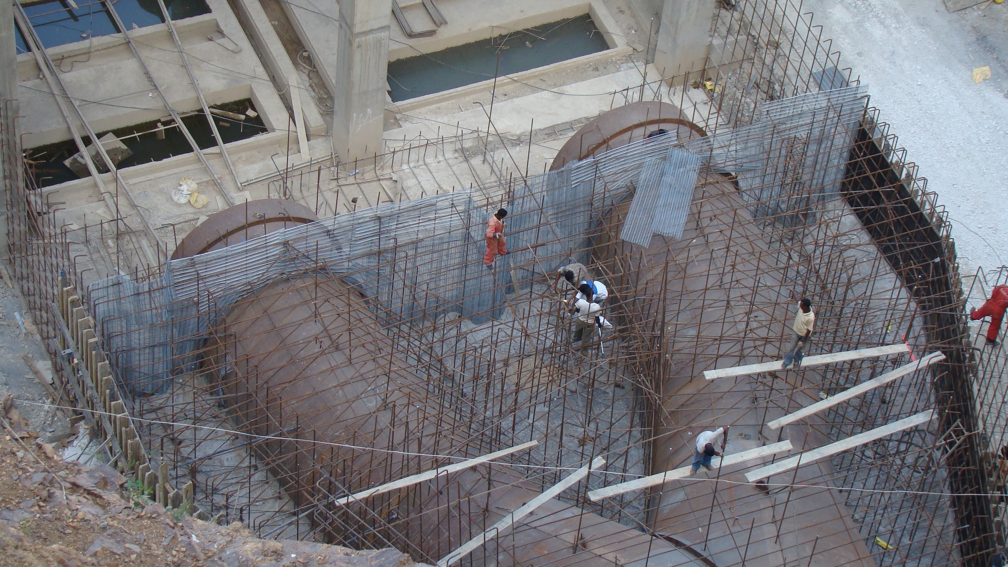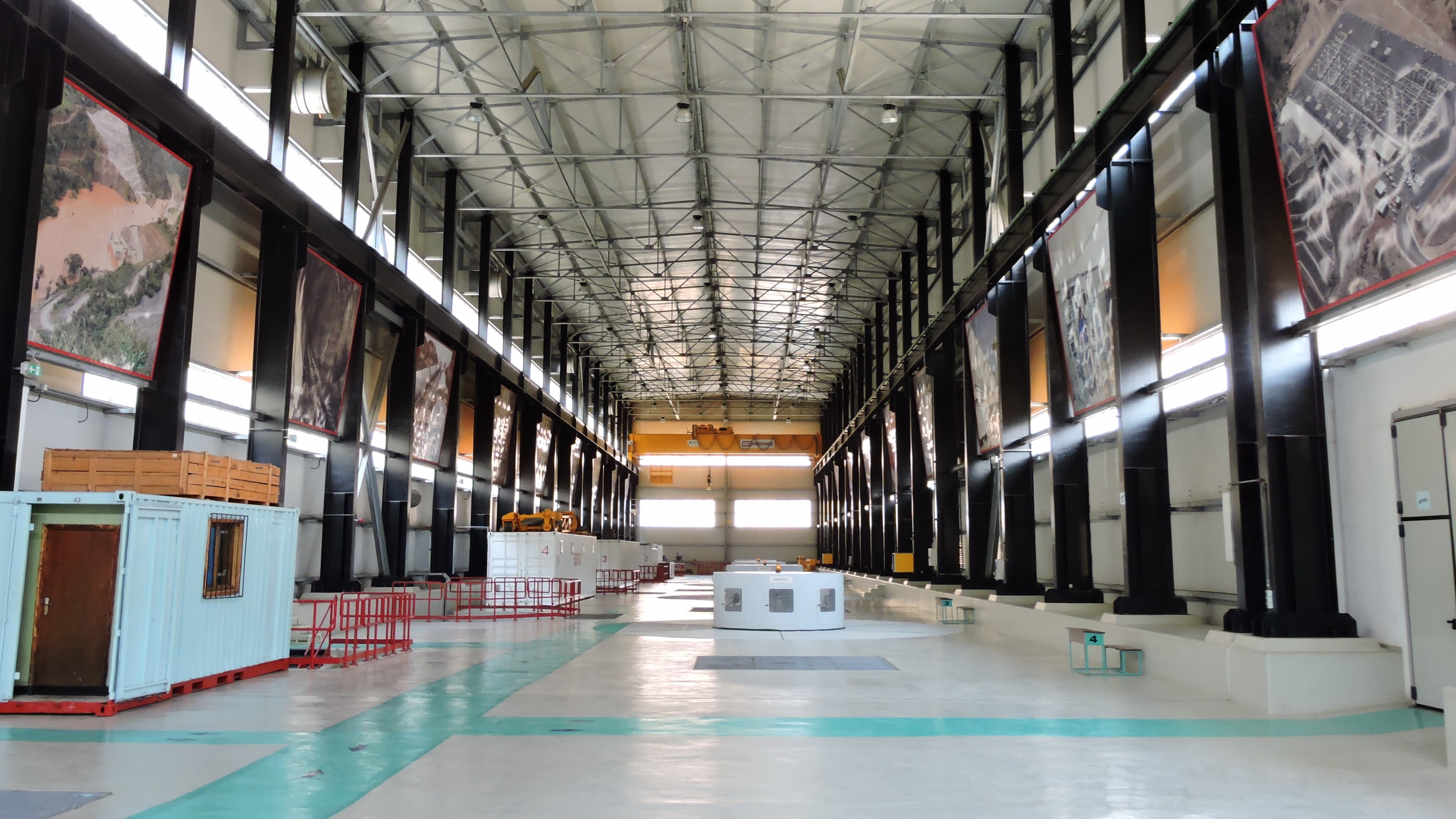 In the outlet area we observe the surge shaft, a cylindrical structure with a throttle at the tunnel end. Two long steel penstocks end into a manifold with a bifurcation from two to four conduits, one for each turbine.