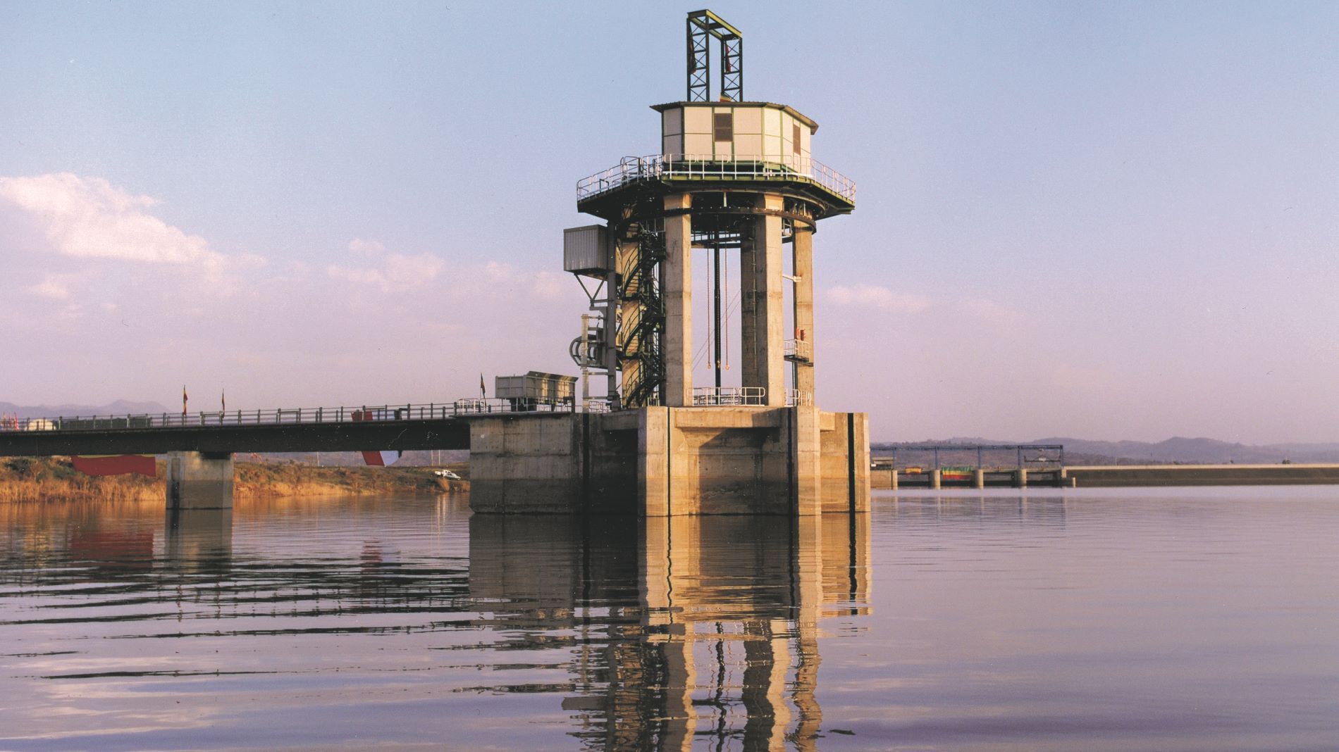 An intake tower, regulated by a cylindrical gate, conveys the water through a power tunnel with a 5.5 m diameter and a length of 9 km.