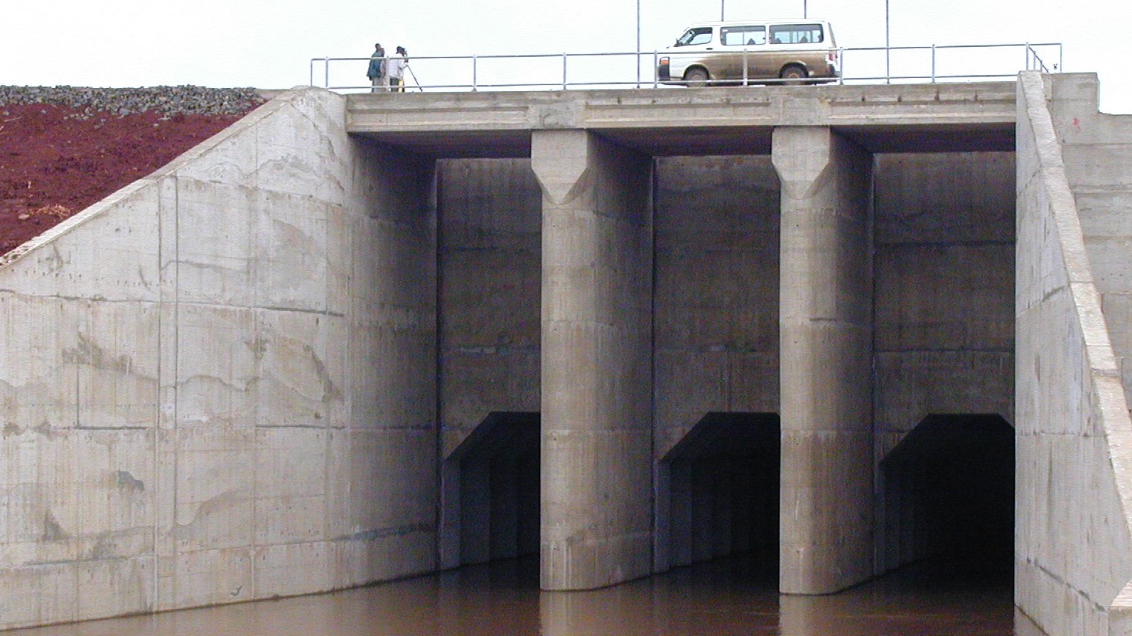 Three box culverts diverted the river during the construction stage and consequently used for the bottom outlet.